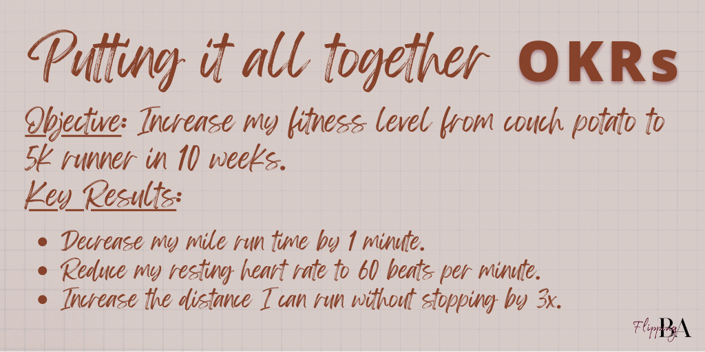 Let’s say you really do want to go from couch potato to 5k runner. Your OKR process might result in this: