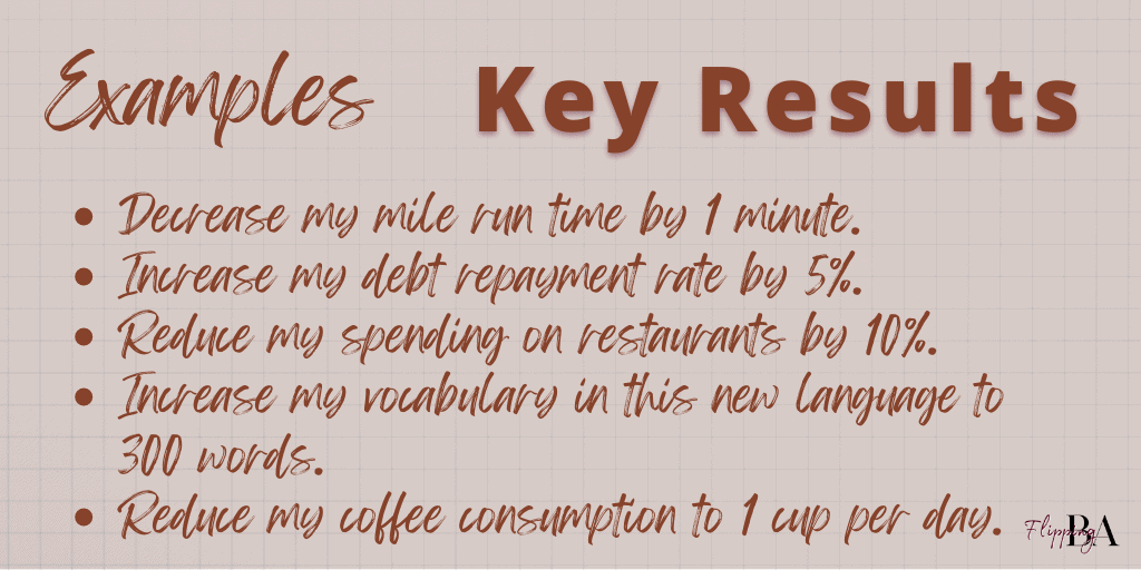 Start by identifying 3-5 metrics that impact your objective. Make sure that the ones you are choosing can be readily quantified. You will use them to measure success. Write a statement that summarizes the changes that you want to see in each metric. The change should be achievable in roughly the same timeframe as the one you set for your objective.